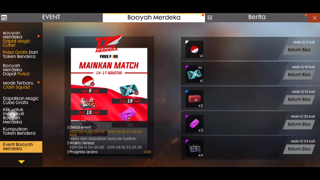 Garena free fire indonesia. Kupas tuntas event booyah merdeka free fire 2019 event booyah merdeka free fire sudah menjadi rutinitas setiap tahunnya ketika menyambut hari kemerdekaan republik indonesia yang jatuh pada tanggal 17 agustus banyak sekali event event yang diselenggarakan. Eventually players are forced into a shrinking play zone to engage each other in a tactical and diverse environment. Tepat tanggal 17 agustus 2019 event booyah merdeka akan mengadakan event seru dengan hadiah hadiah menarik. Garena free fire india beach party events garena free fire india like subscribe my channel. Setelah lama ditunggu tunggu event booyah merdeka dari garena free fire akhirnya sudah mencapai puncaknya.